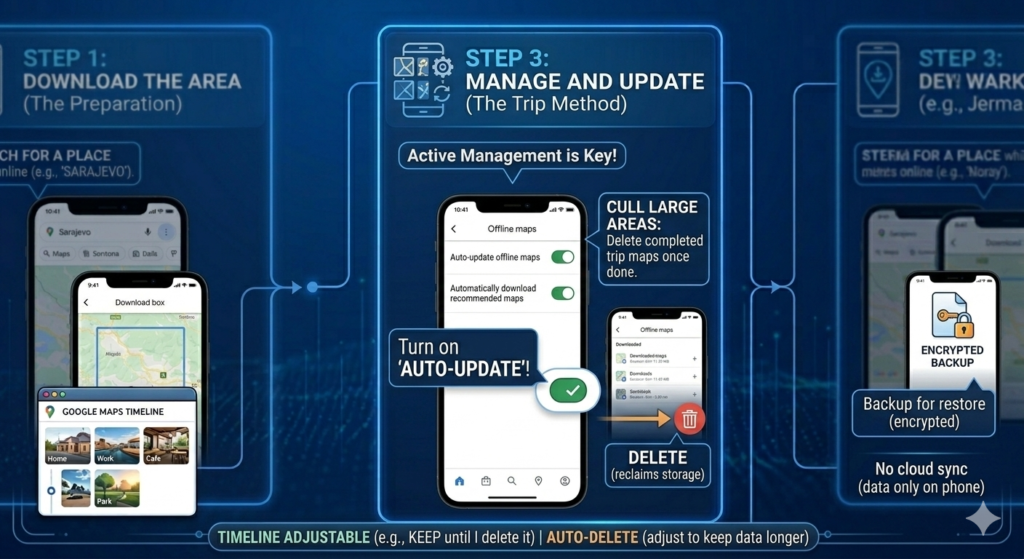 Test offline mode at home: enable Airplane mode, then open Google Maps and try navigating within your downloaded area . This confirms everything works before you rely on it.