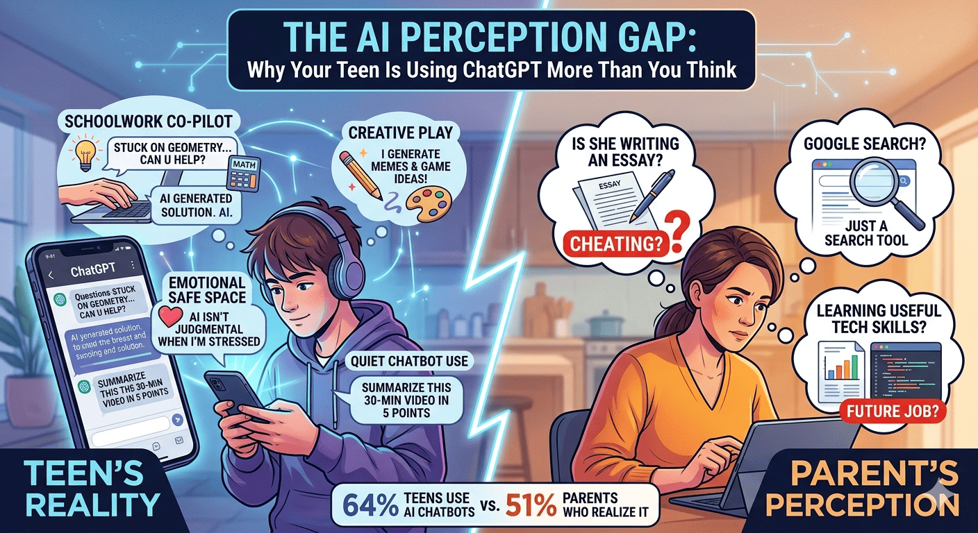 When Pew asked parents if their children use AI chatbots, only 51% said yes. The truth? 64% of teenagers admitted they regularly use them. That’s millions of American families where parents are completely in the dark about their kids’ digital lives.